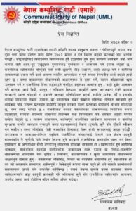 स्वतन्त्र आवागमन, शान्तिपूर्ण राजनीतिक कार्यक्रम सञ्चालन र नागरिक सुरक्षामा गम्भीर व्यवधान पुर्याउने यस्ता घटनाहरूलाई नेकपा (एमाले) कुनै पनि दृष्टिले स्वीकार गर्न सक्दैन, कोशी प्रदेश समितिका अध्यक्ष खतिवडाद्वारा जारी विज्ञप्तिमा उल्लेख छ ।