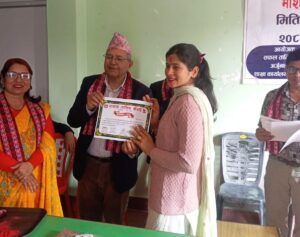 सन्तोषकुमार श्रेष्ठको सहजीकरणमा भएको सात दिवसीय तालिममा झापाको बिर्तामोड वडा नं. ३ का २८ जना महिलाहरुको सहभागिता थियो । गत माघ २२ गते कोशी प्रदेशका पूर्वमन्त्री एकराज कार्कीले उद्घाटन गरेको उक्त तालिमको समापन आज प्रतिनिधि सभाका निवर्तमान सभामुख देवराज घिमिरेले प्रशिक्षार्थीहरुलाई प्रमाण पत्र वितरण गरेर सम्पन्न भएको थियो ।