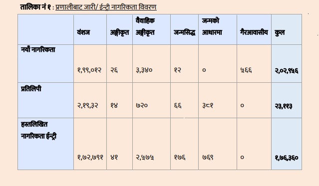 गृह मन्त्रालयको विवरणअनुसार यस अवधिमा दुई लाख दुई हजार ९५६ वटा नागरिकता जारी भएको छ । यसमा वंशजको नागरिकता प्राप्त गर्नेको संख्या एक लाख १९ हजार १२ छ । २६ जनाले अंगीकृत नागरिकता लिएका छन् भन् वैवाहिक अंगीकृत नागरिकता लिनेको संख्या तीन हजार ३४० रहेको छ ।