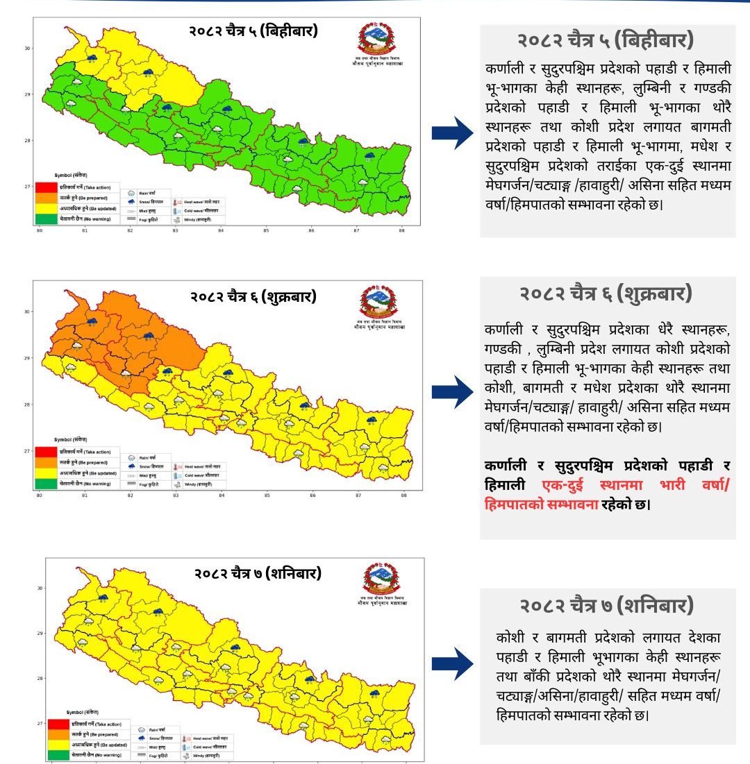 दिउँसो : कर्णाली र सुदूरपश्चिम प्रदेश लगायत बाँकी प्रदेशको पहाडी र हिमाली भूभागमा साधारणतया बादल लाग्ने तथा बाँकी भूभागमा आंशिक बादल लाग्नेछ। कर्णाली र सुदूरपश्चिम प्रदेशको पहाडी र हिमाली भूभागका केही ठाउँहरु, लुम्बिनी र गण्डकी प्रदेशको पहाडी र हिमाली भूभागका थोरै ठाउँहरुमा मेघगर्जन, चट्याङ्ग, हावाहुरी र असिनासहित मध्यम वर्षा र हिमपातको तथा कोशी प्रदेश लगायत बागमती प्रदेशको पहाडी र हिमाली भूभाग, मधेश र सुदूरपश्चिम प्रदेशको तराईका एक, दुई ठाउँमा मेघगर्जन, चट्याङ्ग, असिनासहित हल्का वर्षा र हिमपातको सम्भावना रहेको छ।
