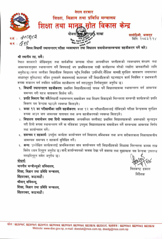 मन्त्रीको निर्देशनपछि मन्त्रालयअन्तर्गतको शिक्षा तथा मानव स्रोत विकास केन्द्रले अव्यवस्थित बस्ती स्थानान्तरण हुँदा त्यहाँ विद्यार्थीको परीक्षा व्यवस्थापन, प्रभावित वस्तिमै रहेका विद्यालय समायोजन तथा समन्वयलाई प्रभावकारी बनाउन विभिन्न निर्देशन तथा अनुरोध जारी गरेको छ।