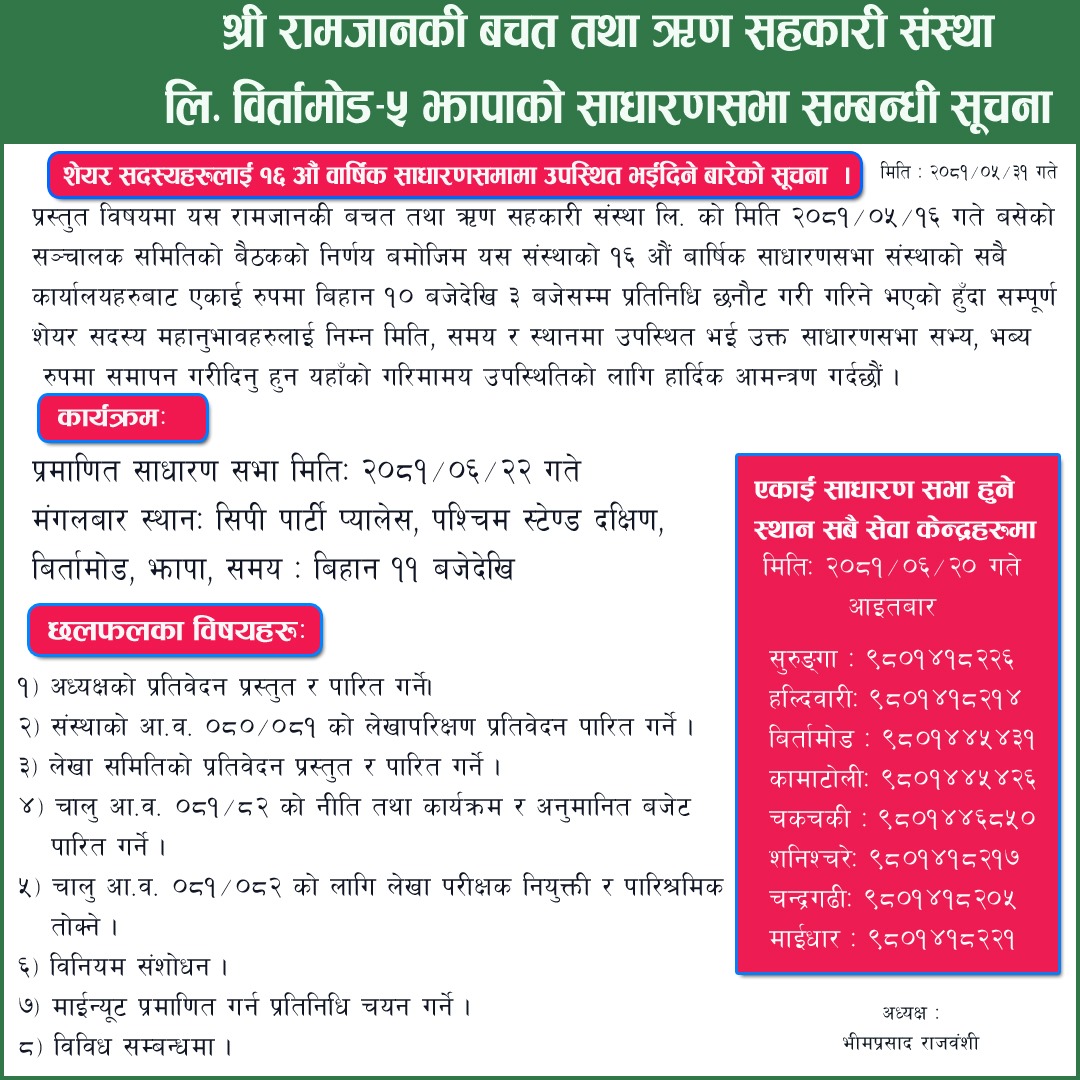 रामजानकी साकोसको साधारण सभा सम्बन्धी सूचना